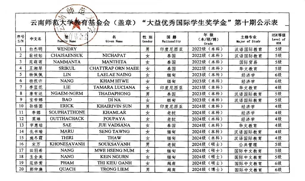 经我会与云南华文学院审核评选,现将第十期“大益优秀国际学生奖学金”获奖名单公示如下: