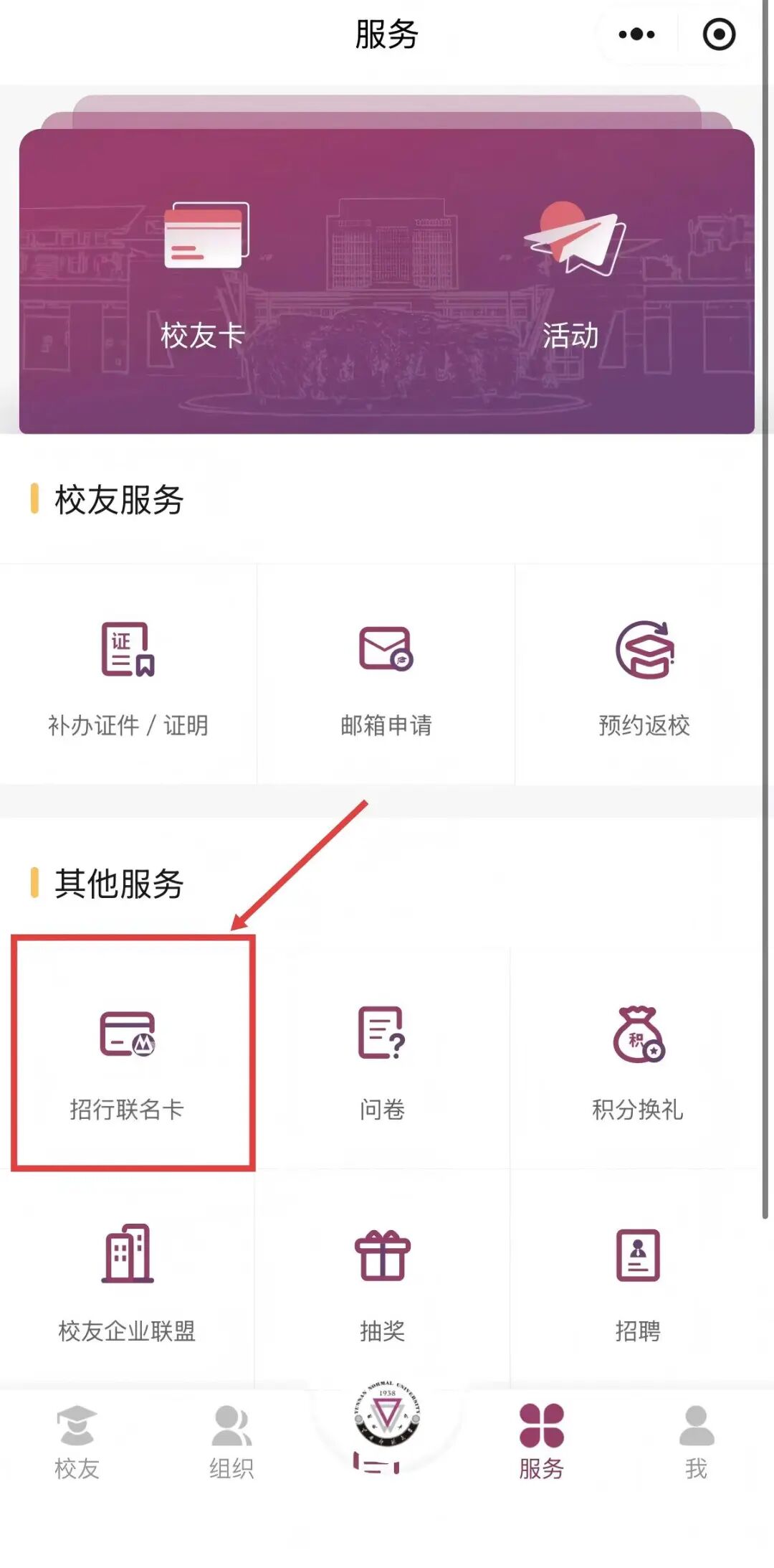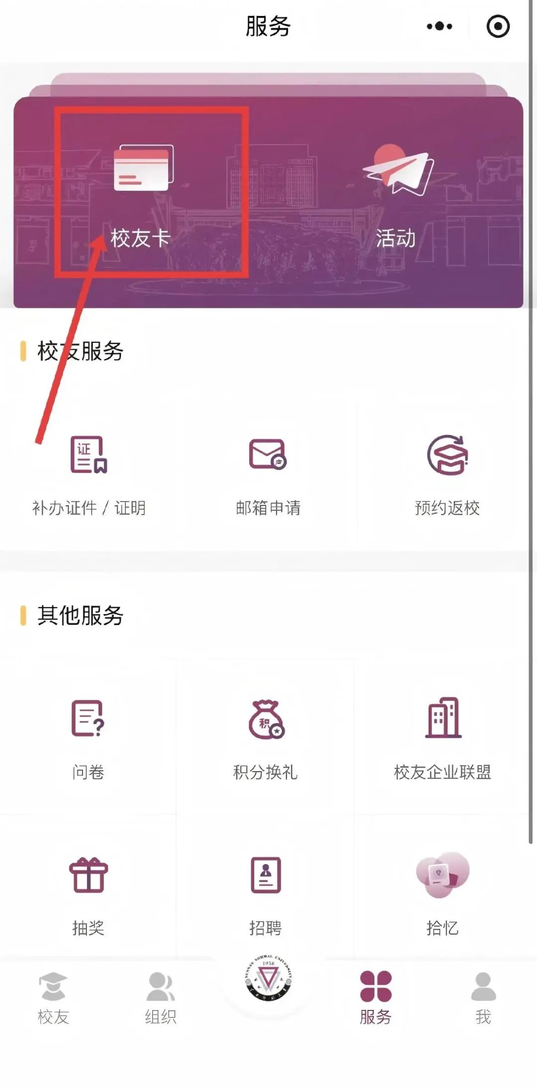 Step2:点击底端“服务”板块,找到左上方“校友卡”选项;申领并填写信息;