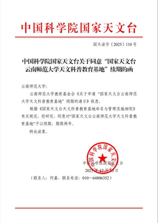 “国家天文台云南师范大学天文科普教育基地”成功获批续期。
