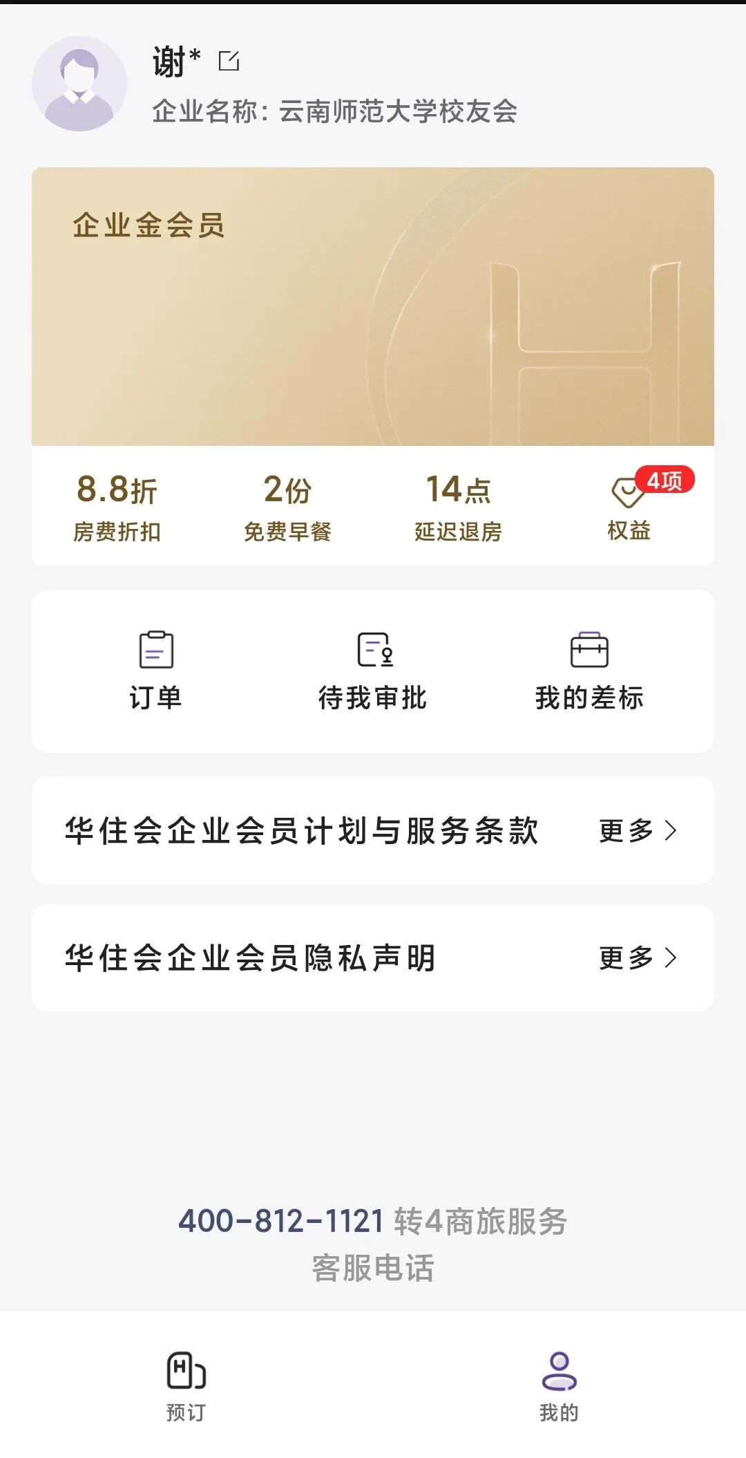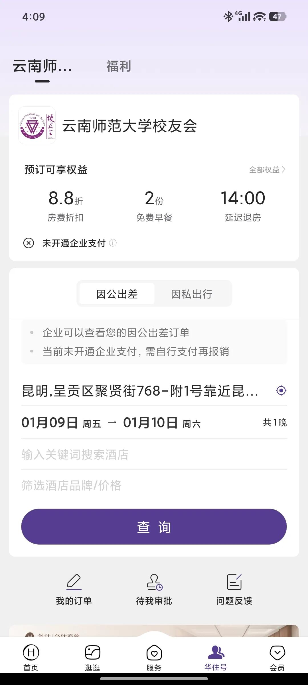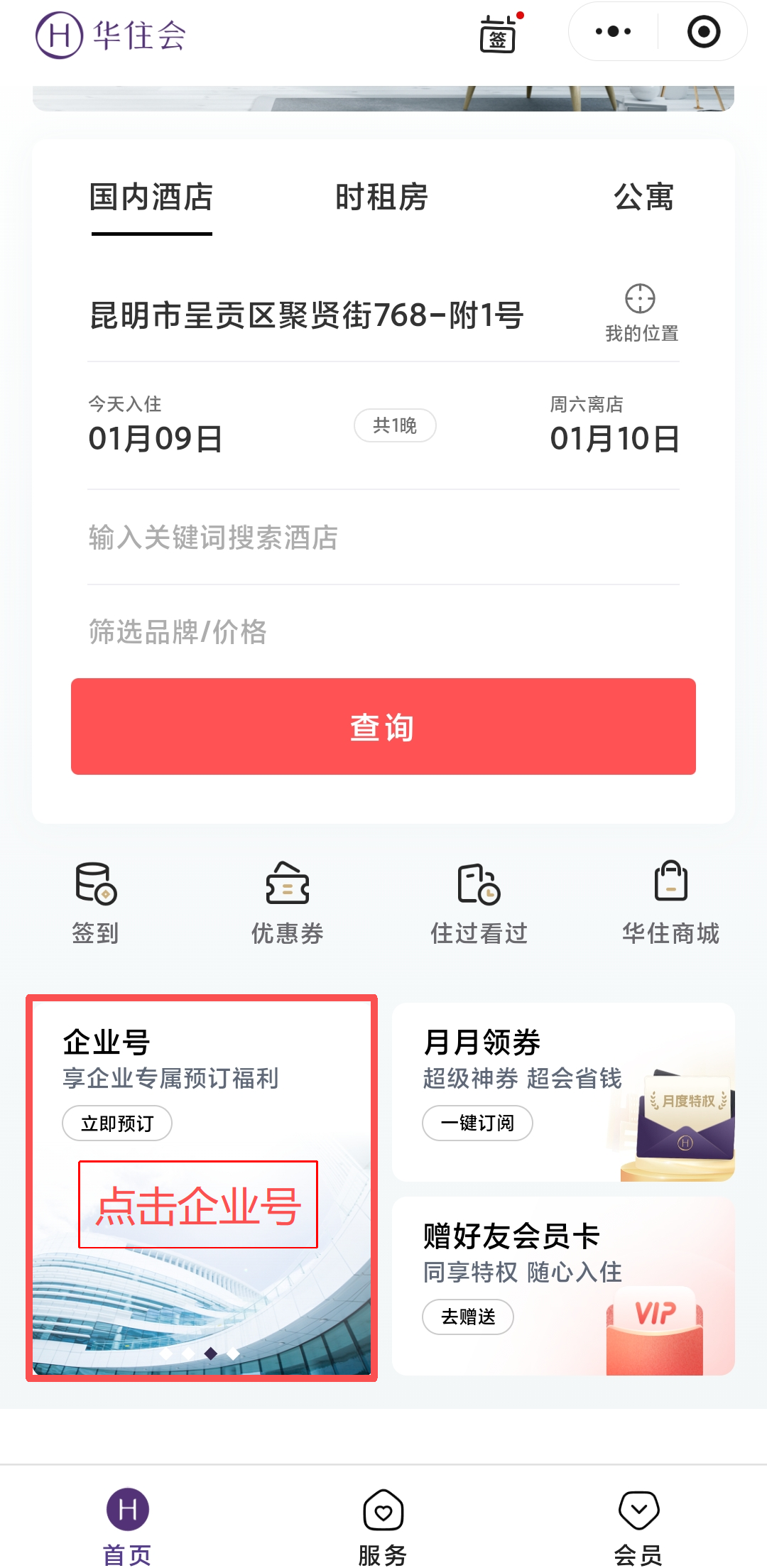 首页进入【华住号】-关联企业名称-查询预订酒店