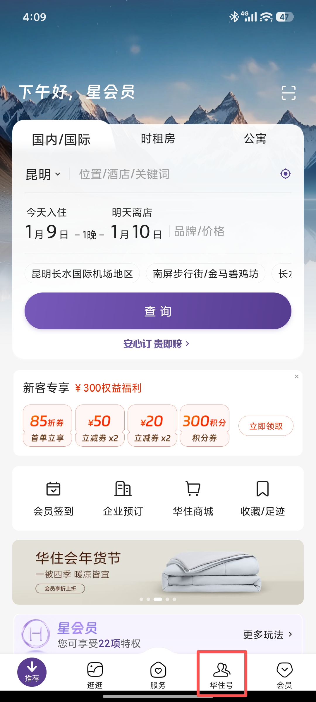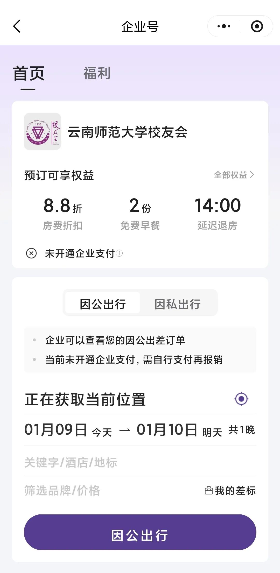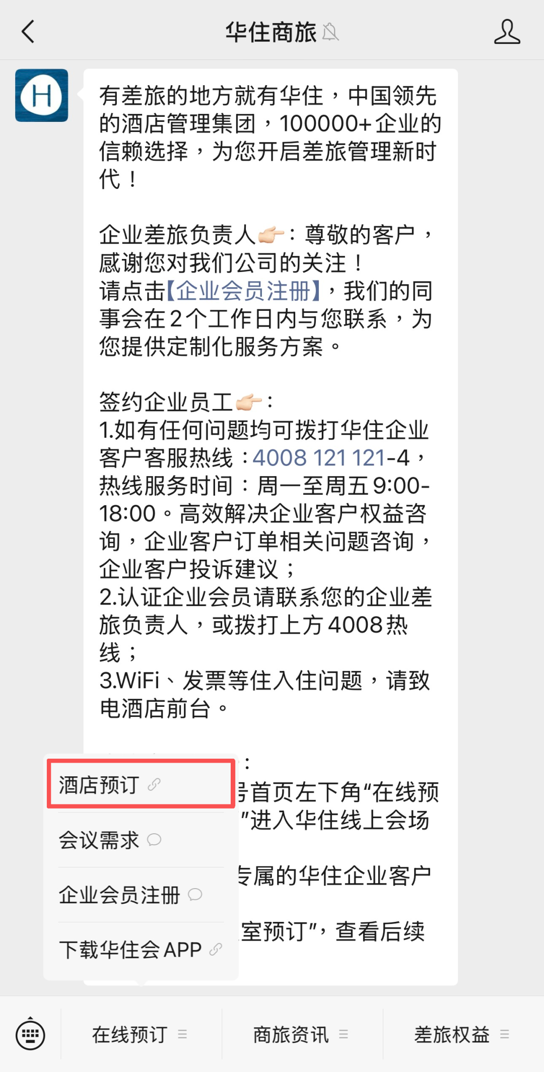 首页进入【华住号】-关联企业名称-查询预订酒店