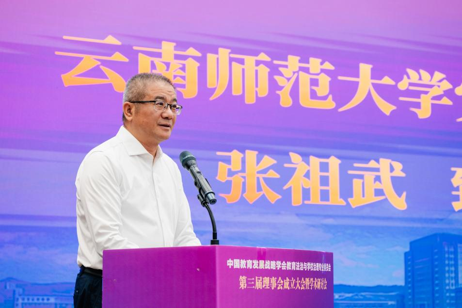 张祖武在致辞中对长期以来关心支持云南师范大学建设发展的各界同仁致以感谢,介绍了云南师范大学的历史沿革和基本情况。他指出,依法治教、依法治校是推进教育治理体系和治理能力现代化的必然要求,是落实立德树人根本任务、办好人民满意的教育的根本保障。当前我国正全面建设教育强国,亟须以法治思维破解难题、完善制度设计、激发内生动力,专委会新一届理事会的成立,标志着其发展迈入承前启后、继往开来的新阶段。他邀请专家学者为学校教育学科、法学学科把脉问诊并提供专业指导,并体验“有一种叫云南的生活”。