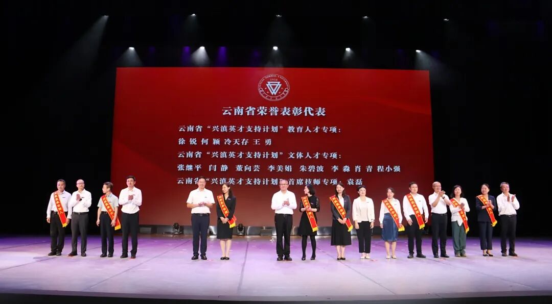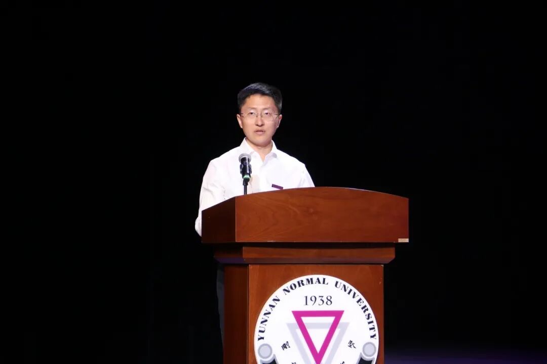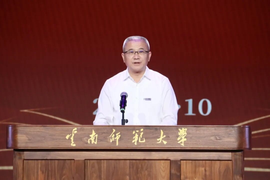 教师代表罗毅、实验中学教师代表崔洁分享教育感受。罗毅围绕“传承、坚守、耕耘、感恩”四个关键词,讲述其在教学与科研路上的点滴实践与感悟,“展望未来,我将继续以西南联大先贤为榜样,扎根红土,坚守讲台,以科研守护绿水青山,以教育延续家国使命。我也坚信,只要我们众志成城、同心同向,定能让教育之光照亮云岭千山万水,让高原明珠永葆清澈,让边疆教育书写更加绚烂的时代华章!”他激动地说。