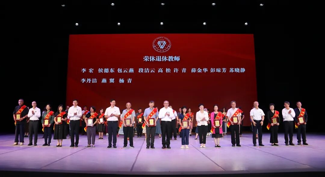 全体在家校领导、省管干部,职能部门、教学辅助机构和党群部门负责人,荣休教师、新入职教师、退休教师代表,各学院(学部)主要负责人以及来自各附属中小学的师生代表共1000余人参加表彰大会。