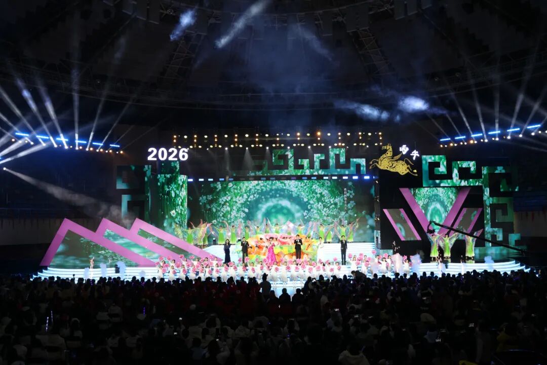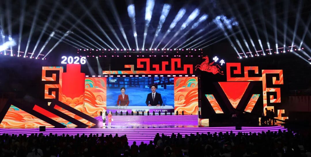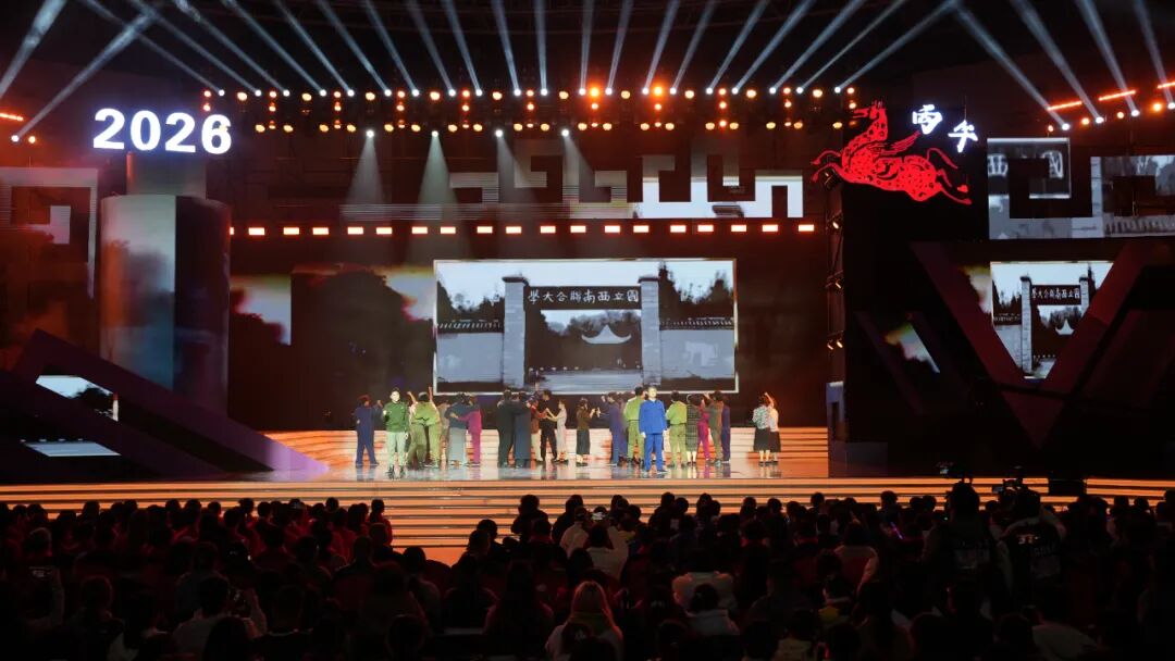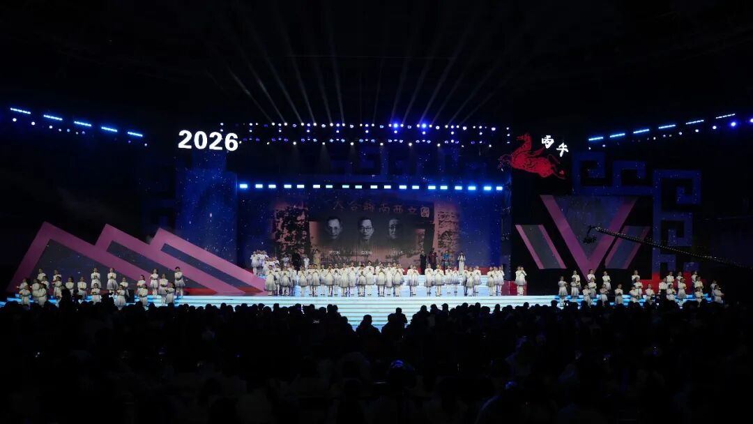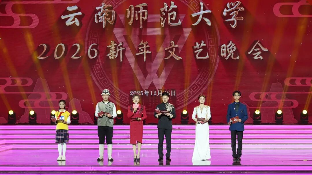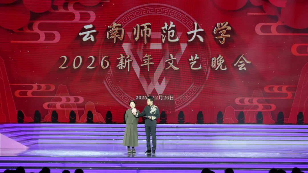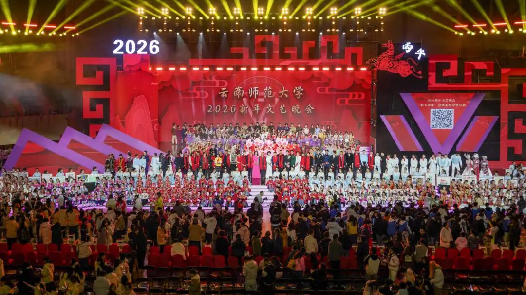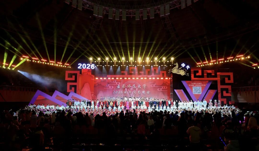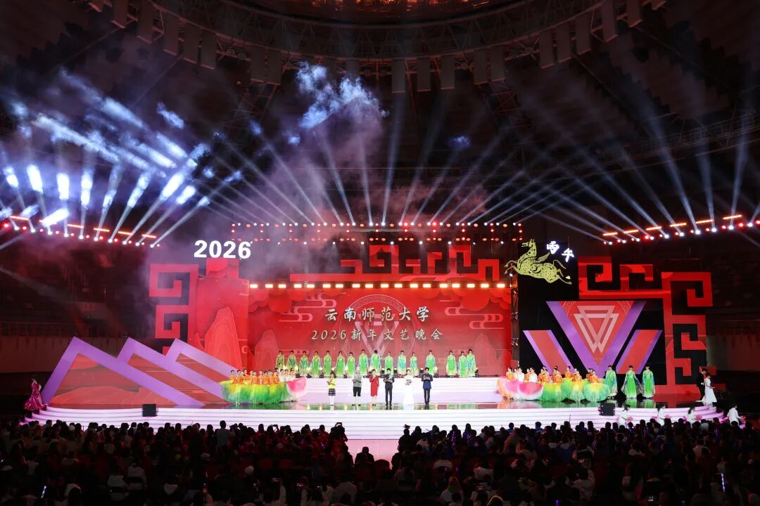 12月26日晚,云南师范大学西区体育馆内欢声笑语,其乐融融、喜气洋洋的氛围中,“云师大家庭”欢聚一堂。老教授们诉说深情,莘莘学子绽放青春风采,小朋友们活力满满、点燃热情……云师2026新年文艺晚会用满满“新”意,送上新一年的真挚祝福。